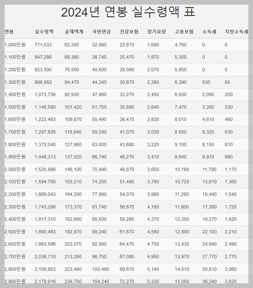 2024년 연봉 실수령액 표입니다. 연봉 1000만원부터 1.5억까지 실수령액 표인데요. 절대적이지는 않으니 참고하세요. 연봉과 자신의 실수령액도 비교해보세요.