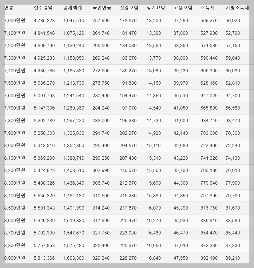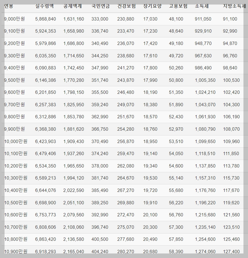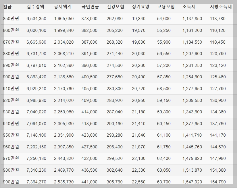 2. 연봉 실수령액 표