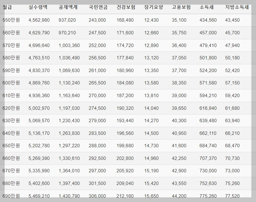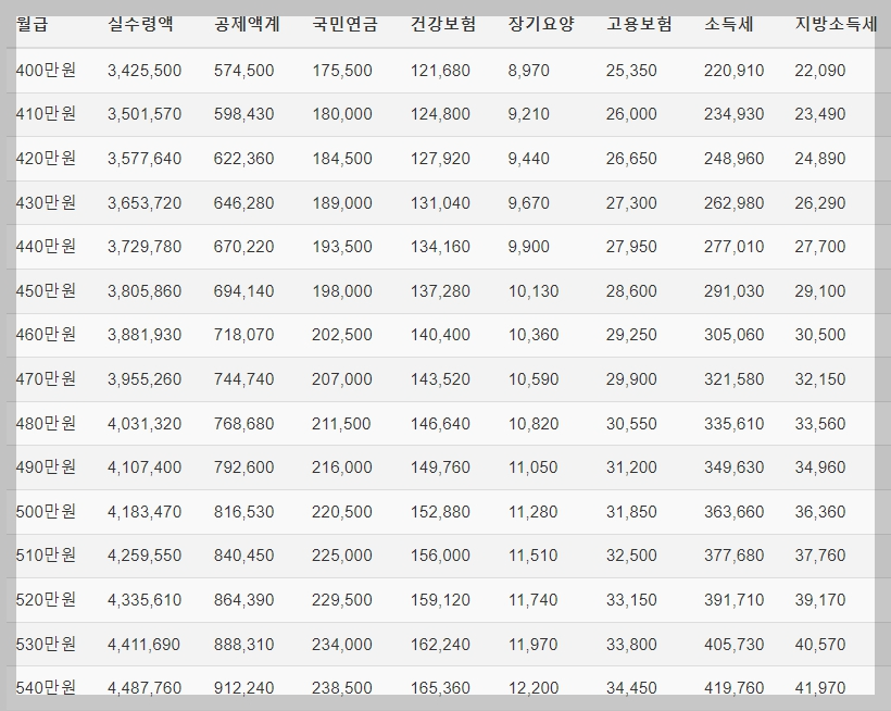 3. 월급 실수령액 표