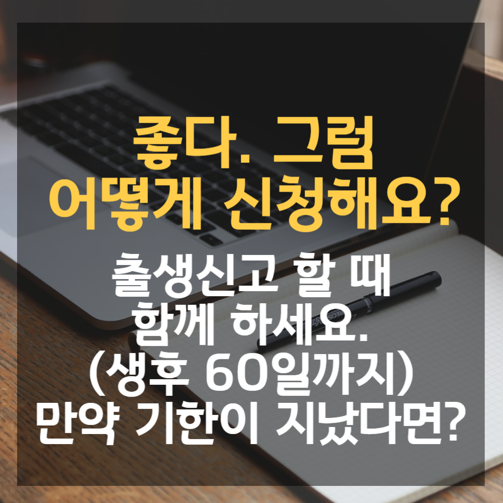 혹시 출생일 이후 60일이 넘어갔다면? 그래도 신청은 할 수 있지만, 지난 기간에 대해서는 받을 수 없다고 하니 꼭 출생신고 할 때 해주시는 것이 좋습니다. 혹시나 넘어갔다고 해도 하루 빨리 신청해주세요.