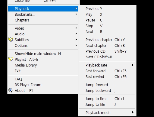 Playback : 앞으로, 재생, 일시정지, 정지, 다음으로 등의 단축키를 사용할 수 있습니다. 그 외에 필요한 기능은 화면을 참고하세요.